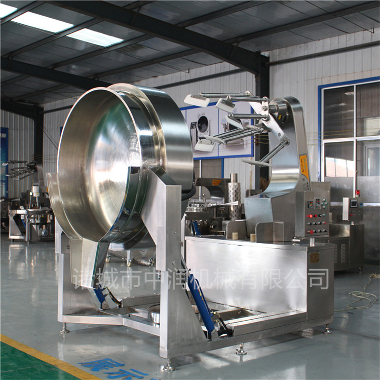 炒菜機采用一次沖壓成型的半球形不銹鋼鍋體,采用蒸汽、液化氣、天然氣、電磁加熱、電加熱等加熱形式,攪拌方式采用特殊的傾斜式傳動,使用的行星式攪拌器與鍋體充分接觸,實現(xiàn)傳動公轉(zhuǎn)與自轉(zhuǎn)的不整數(shù)傳動比,使鍋內(nèi)無攪拌死角。使用的傳動與密封結(jié)構(gòu),使傳動部分與鍋內(nèi)潔凈、衛(wèi)生。采用變頻調(diào)速動力,運行更平穩(wěn)。采用液壓升降,翻鍋運料,免拆裝攪拌器,節(jié)省人力,降低勞動強度,是性能優(yōu)良的食品加工設(shè)備。