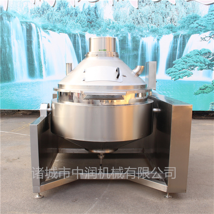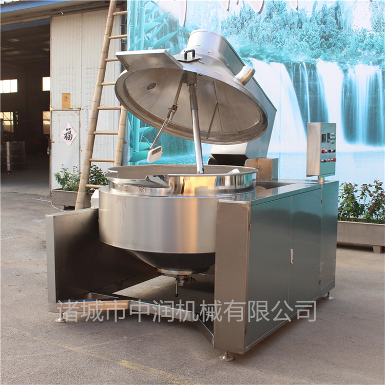 炒醬鍋鍋體為一次沖壓成型的半球形不銹鋼鍋體,采用蒸汽、燃?xì)狻㈦姶诺燃訜嵝问?,攪拌方式采用特殊的傾斜式傳動(dòng),使用的行星式攪拌器與鍋體充分接觸,實(shí)現(xiàn)傳動(dòng)公轉(zhuǎn)與自轉(zhuǎn)的不整數(shù)傳動(dòng)比,使鍋內(nèi)無攪拌死角。使用的傳動(dòng)與密封結(jié)構(gòu),使傳動(dòng)部分與鍋內(nèi)潔凈、衛(wèi)生。采用變頻調(diào)速動(dòng)力,運(yùn)行更平穩(wěn)。另本機(jī)采用液壓升降,翻鍋運(yùn)料,免拆裝攪拌器,節(jié)省人力,降低勞動(dòng)強(qiáng)度,是性能優(yōu)良的食品加工設(shè)備。