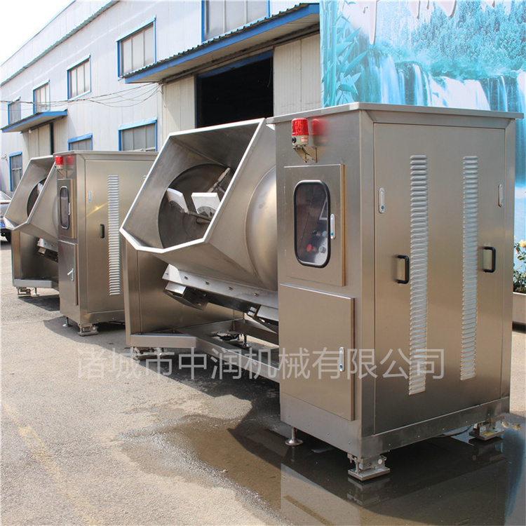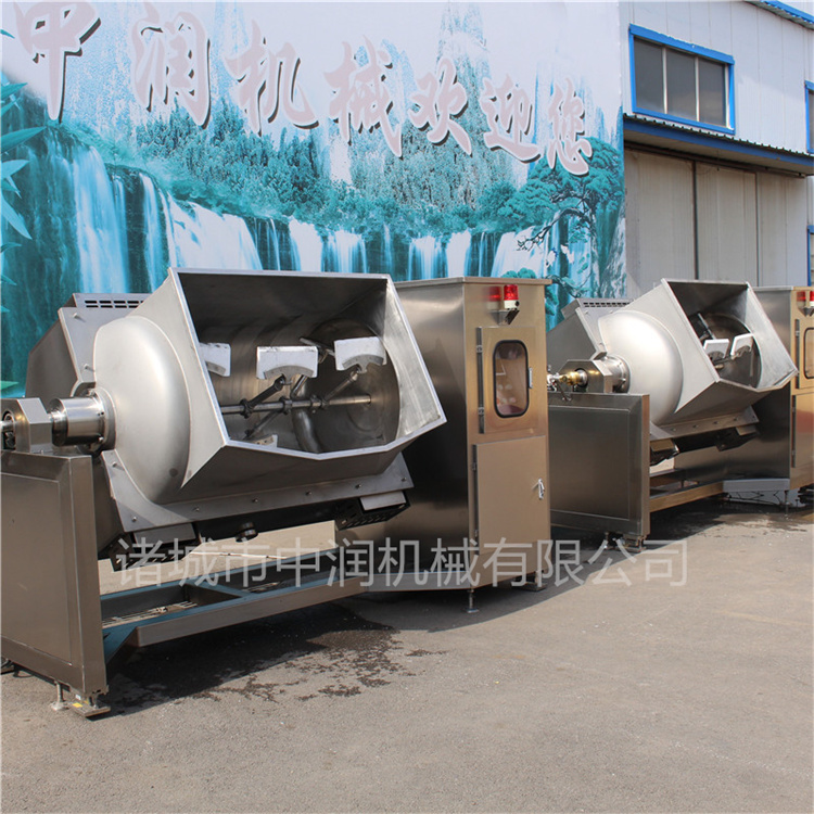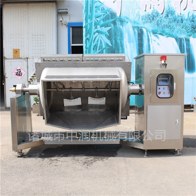 本機(jī)的U型鍋體,鍋體及表面接觸部分均采用304不銹鋼制造,易于清洗,符合食品衛(wèi)生要求。全封閉槽形鍋體,夾套采用電磁、電加熱導(dǎo)熱油、燃?xì)狻⒄羝訜岬燃訜岱绞?,受熱面積大,熱效率高,適合不同物料對溫度和升溫速度的要求。無段變速與蝸輪、減速機(jī)的組合傳動,增大了橫軸攪拌的力矩。采用聚四氟乙烯材質(zhì)刮板的攪拌器,在物料的翻滾攪拌過程中,攪拌器與鍋體的充分接觸,確保了無攪拌死角。鍋體的開蓋、卸料、復(fù)位采用氣壓、機(jī)械傳動控制,操作為方便。