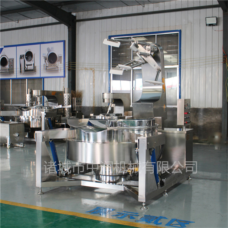 炒菜機采用一次沖壓成型的半球形不銹鋼鍋體,采用蒸汽、液化氣、天然氣、電磁加熱、電加熱等加熱形式,攪拌方式采用特殊的傾斜式傳動,使用的行星式攪拌器與鍋體充分接觸,實現(xiàn)傳動公轉(zhuǎn)與自轉(zhuǎn)的不整數(shù)傳動比,使鍋內(nèi)無攪拌死角。使用的傳動與密封結(jié)構(gòu),使傳動部分與鍋內(nèi)潔凈、衛(wèi)生。采用變頻調(diào)速動力,運行更平穩(wěn)。采用液壓升降,翻鍋運料,免拆裝攪拌器,節(jié)省人力,降低勞動強度,是性能優(yōu)良的食品加工設(shè)備。