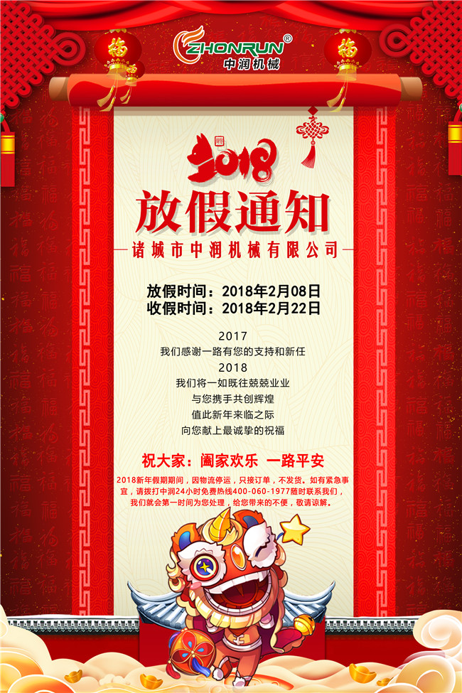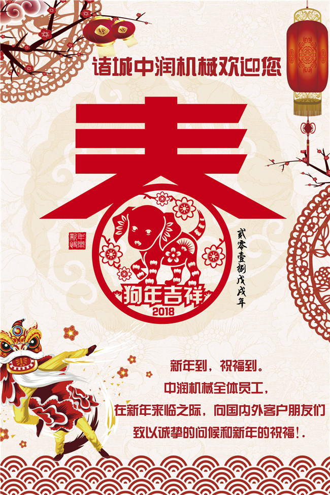 雞去長空辭舊歲、狗來大地迎新春。滿懷豐收的喜悅,滿載勝利的榮耀,我們揮手作別砥礪奮進(jìn)的2017年,闊步邁入華章初展的2018年?;厥淄?,深懷感恩之心;放眼前路,難抑澎湃豪情。值此辭舊迎新之際,中潤機(jī)械全體員工,向一直以來關(guān)心和支持我們的國內(nèi)外客戶朋友們表示衷心感謝和崇高敬意!向各位家人們致以節(jié)日問候和誠摯祝福!